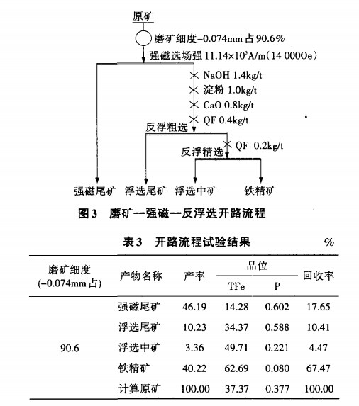 (3)原礦含磷0.377%,偏高,但磷礦物大多分布于石英中,選別過程中隨石英進入尾礦,鐵精礦含磷降至0.085%,達到了國家標準。